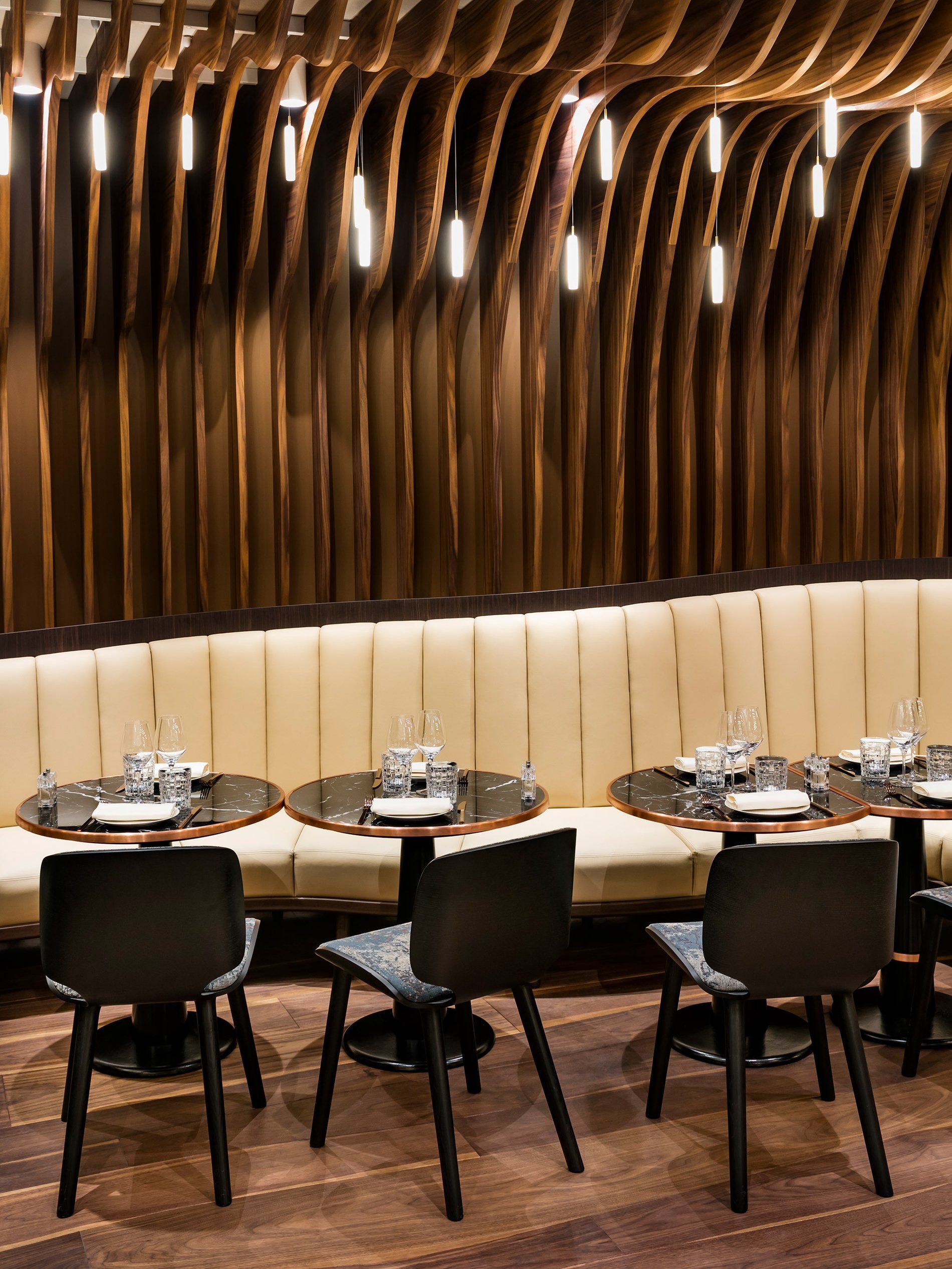 Sous une vague de bois sculptée, clin d'œil à Christo qui emballa le Pont-Neuf en 1985, Odette déploie son univers intimiste et vivant. Boiseries chaleureuses, touches cuivrées, banquettes matelassées couleur cognac et suspensions graphiques composent un décor élégant et accueillant. Un lieu qui cultive l’esprit d’une adresse parisienne contemporaine, où l’on se sent immédiatement chez soi, entre convivialité assumée et raffinement discret. Un décor qui raconte une histoire…